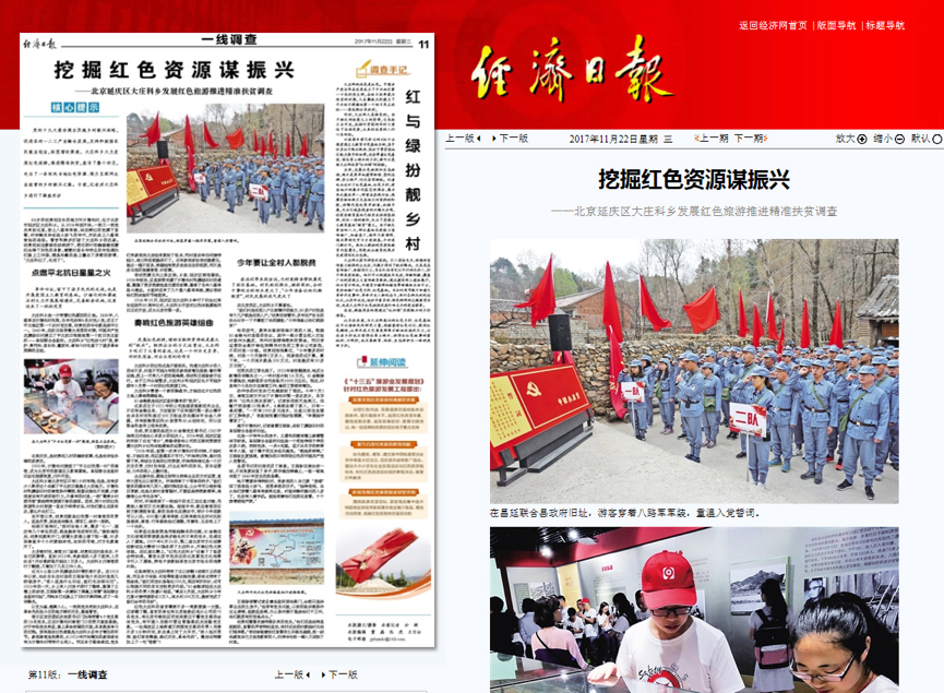 2017年11月22日,由国务院主办的中央直属党报《经济日报》一线调查版以《挖掘红色资源谋振兴》为题,整版报道了91金融旗下的红色大庄科旅游基地。